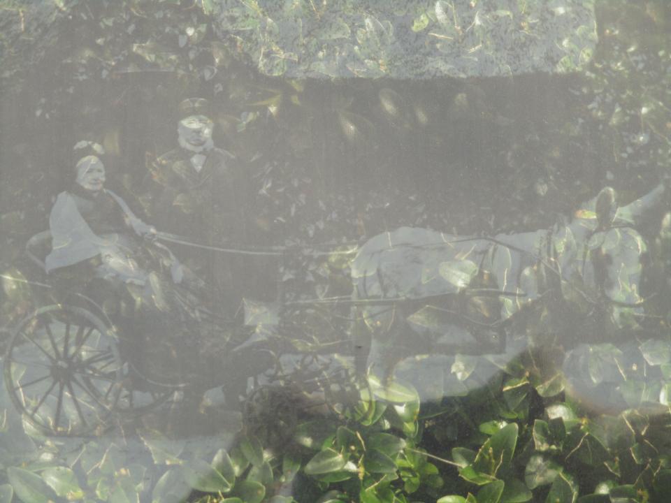 Acetate photo of Mr and Mrs T.R. Bolitho in a donkey carriage by the summerhouse circa 1890 with hedge behind. Photo by Elaine and Jo.