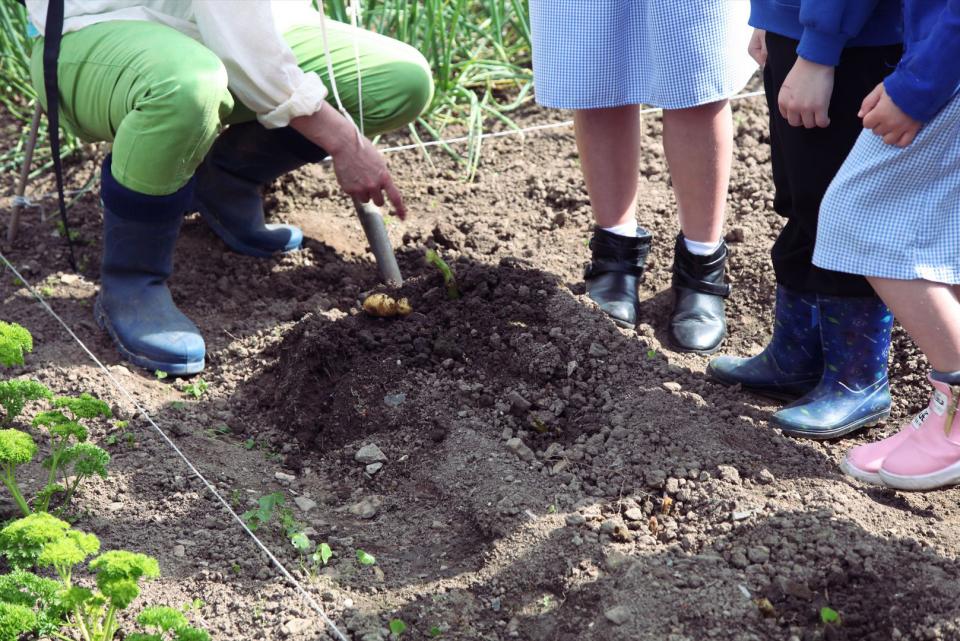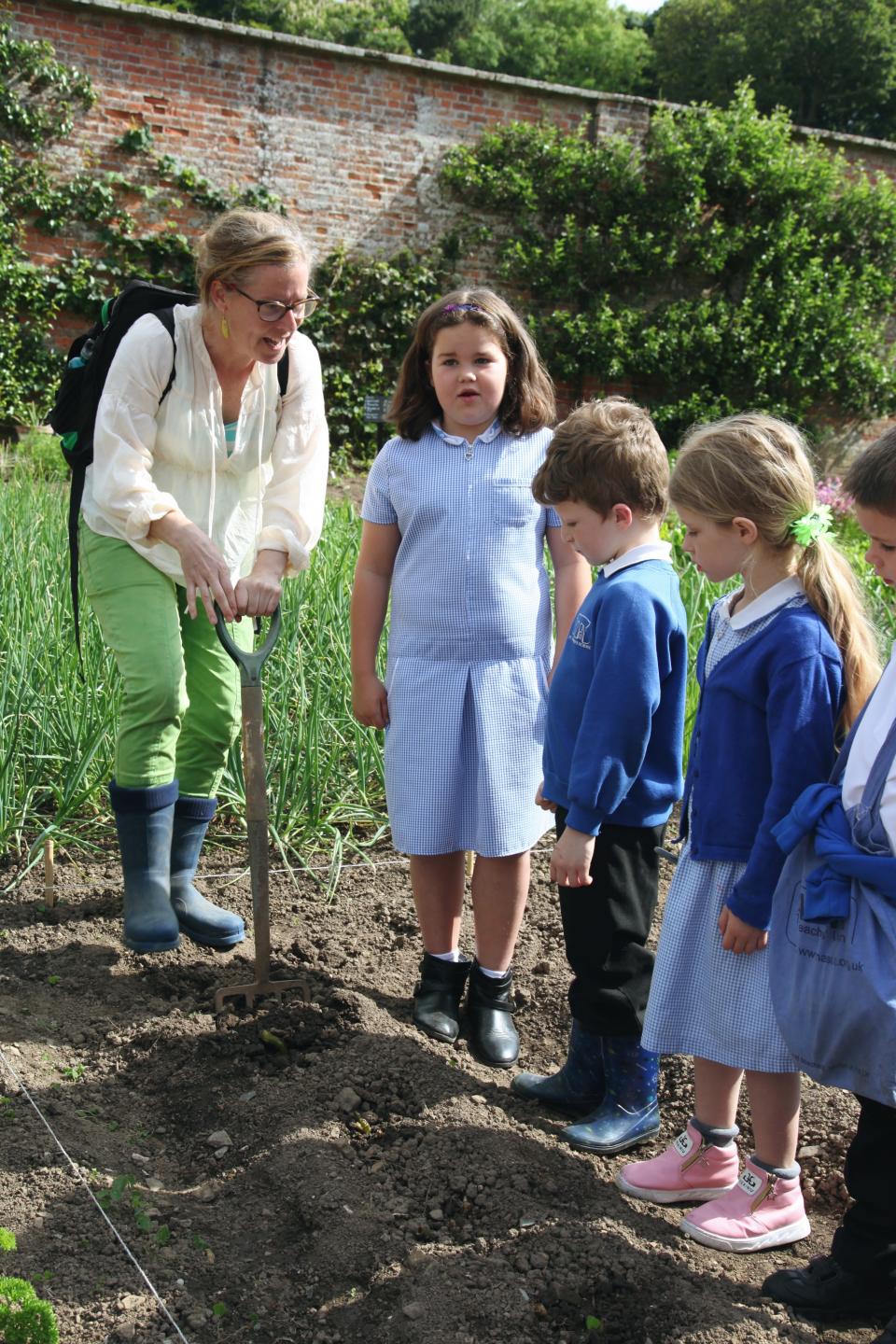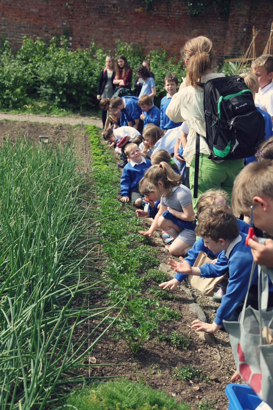 Dominica discussed different aspects of the vegetable garden as the children followed her. Potato and Beetroot ready for harvest were dug and pulled, and herbs such as different Chamomile and Marjoram were touched and some tasted. Herbs for teas were shared, herbs to keep you calm were pointed out.