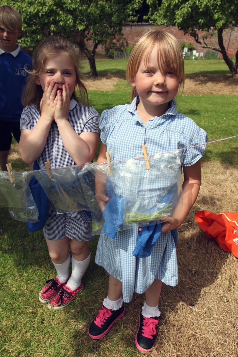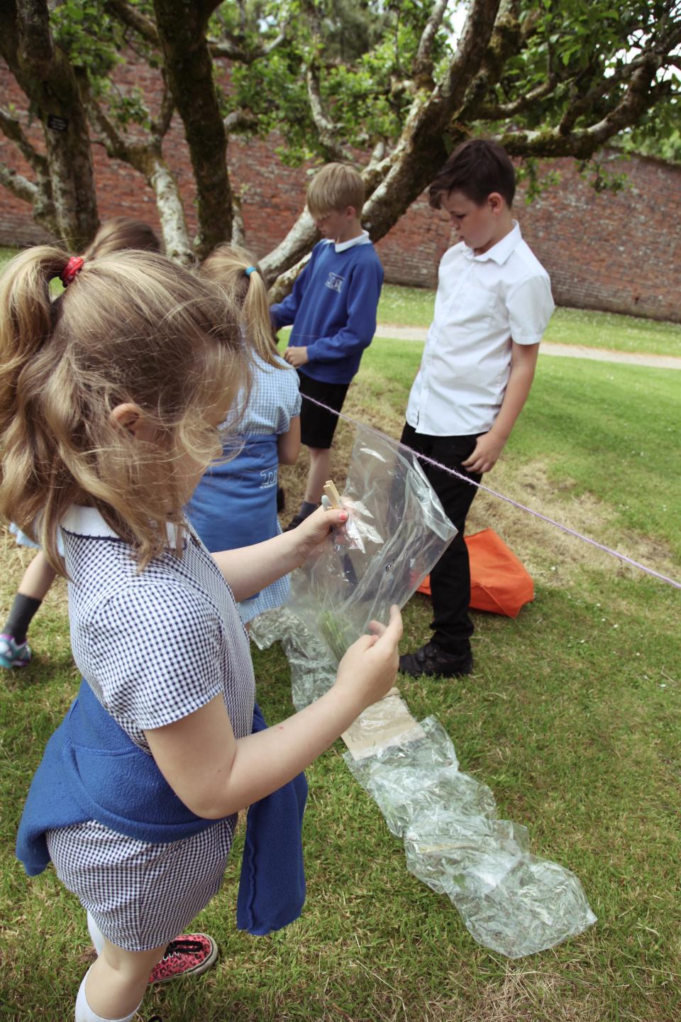 During the second part of the morning, the children worked in the Orchard. Here, the children helped each other order their bags into a sequence whilst pegging them onto purple and green washing lines. Dominica pointed out that they had now had become walking plant maps - a record of where they had just been. They photographed them and then played around them.