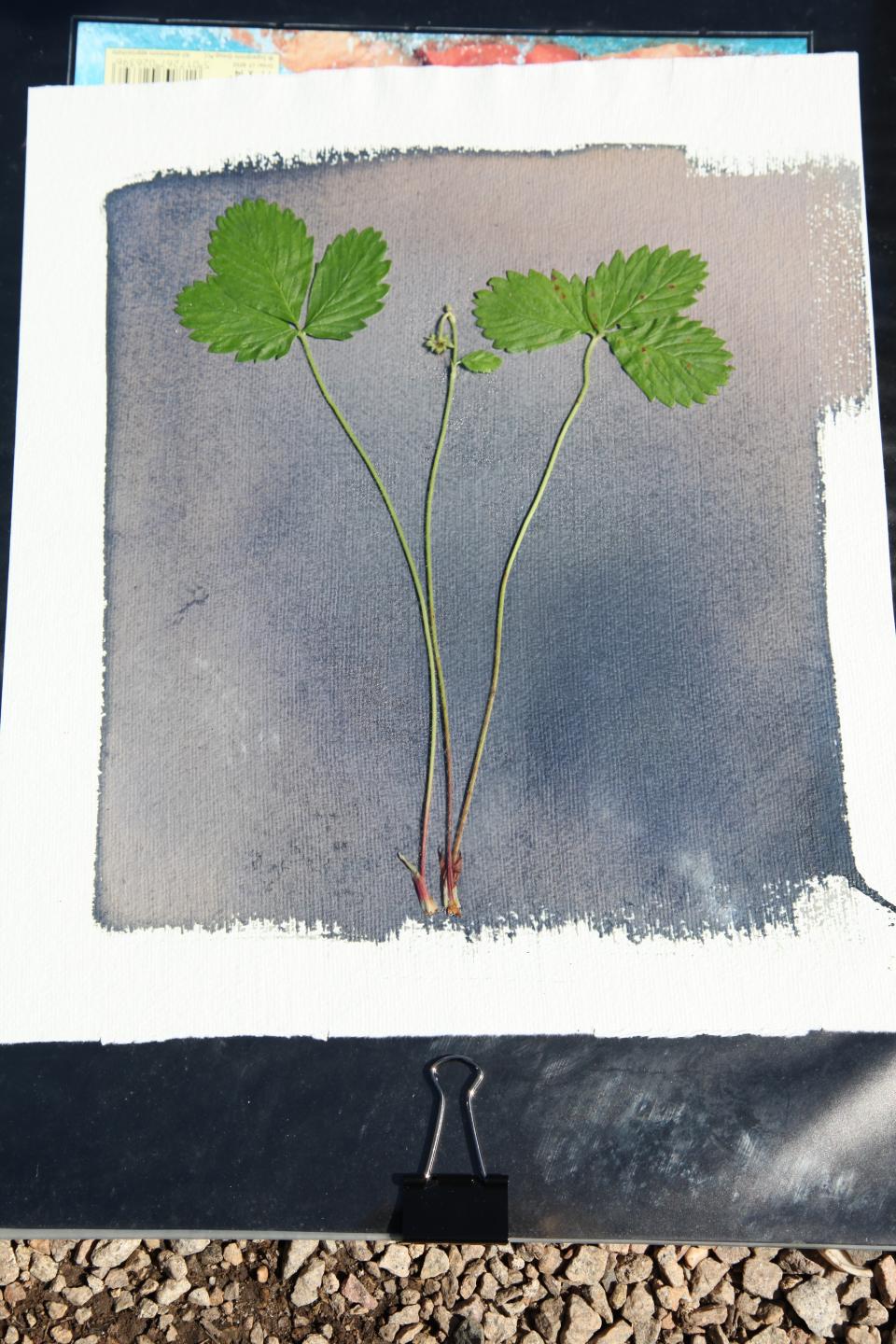 The method of ‘sun printing’ uses ferric ammonium citrate and potassium ferricyanide on paper. The specimen is then laid on the paper and pressed with a glass plate which is then exposed in the sun. It is then washed in water and dried. The detailed imprint of the plant is left on the paper while the uncovered parts becomes dark blue when exposed to light.